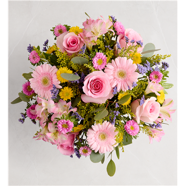 Spring is a time to refresh and reach out. Our spring bouquet celebrates that sentiment. Pastel pink and yellow blooms are loosely gathered with lush greenery for style and texture. Designed in our rustic, gray-washed wooden cube, it’s a gift that delivers on your feelings in the most beautiful way.